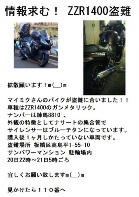 JUGEMテーマ:ガレージ・カーポート 盗難情報 ZZR1400 【以下コピペ】 拡散願います!m(__)m マイミクさんのバイクが盗難に合いました!! 車種はZZR1400のガンメタリック。ナンバーは練馬8810 、 外観の特徴としてナサートの集合管で サイレンサーはブルーチタンになっています。 購入後1ヶ月しかたっていない車両です。 盗難場所 板橋区高島平1-55-10 サンパワーマンション 駐輪場内 20日22時〜21日5時ごろ 宜しくお願い致しますm(__)m 見かけたら110番へ
