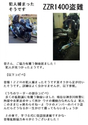 JUGEMテーマ:ガレージ・カーポート 先日、こちらのブログでも盗難情報としてご紹介させていただいた、 ZZR1400ですが、無事に発見なされたそうです。 本当に見つかって良かったですね。 【以下コピペ】 皆様!ZZRの犯人捕まったそうです 某オクから足が付いたそうです。 詳細はよく分かりませんが、以下参照。 (うちのリーダーの部分コピペ) 多くの拡散誠に有難う御座いました 現在は神奈川県警に拘留中余罪追求中って所か ウチの機動力なめんなよ 犯人このままじゃ終わらせねーよ ウチのメンバーのバイク...