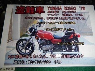 JUGEMテーマ:ガレージ・カーポート 盗難情報 RD250 以下コピペ きのう「何か少しでも情報があれば」とこんな写真を持ってこられた方がいました。 かなり昔のオートバイです。 もうこのあたりを走っているとは思えませんが どこかで見かけたらご本人あてご連絡をしてあげてください。 30年も連れ添った“相棒”です。 この写真は恐らく今年の年賀状用に撮られたもの、それがこんなことに使われてしまうとは。。。 本当に許せません! みなさまご協力よろしくお願いいたします!