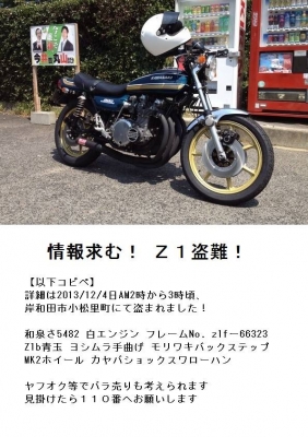 盗難情報 Z1 情報求む! Z1盗難! 【以下コピペ】 詳細は2013/12/4日AM2時から3時頃、 岸和田市小松里町にて盗まれました! 和泉さ5482 白エンジン フレームNo. z1fー66323 Z1b青玉 ヨシムラ手曲げ モリワキバックステップ MK2ホイール カヤバショック スワローハン ヤフオク等でバラ売りも考えられます 見掛けたら110番へお願いします! JUGEMテーマ:ガレージ・カーポート