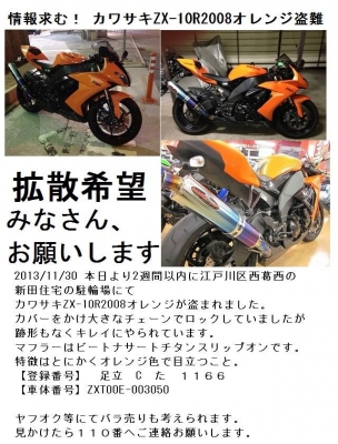 JUGEMテーマ:ガレージ・カーポート 盗難情報 ZX−10R 情報求む! カワサキZX-10R2008オレンジ盗難 【以下コピペ】 2013/11/30 本日より2週間以内に江戸川区西葛西の 新田住宅の駐輪場にて カワサキZX-10R2008オレンジが盗まれました。 カバーをかけ大きなチェーンでロックしていましたが 跡形もなくキレイにやられています。 マフラーはビートナサートチタンスリップオンです。 特徴はとにかくオレンジ色で目立つこと。 【登録番号】 足立 C た 1166 【車体番号】ZXT00E-003050 ヤフ...