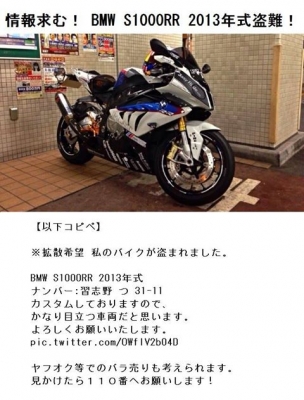 JUGEMテーマ:ガレージ・カーポート 盗難情報 BMW S1000RR 2013年式 【以下コピペ】 ※拡散希望 私のバイクが盗まれました。 BMW S1000RR 2013年式 ナンバー:習志野 つ 31-11 カスタムしておりますので、 かなり目立つ車両だと思います。 よろしくお願いいたします。 pic.twitter.com/OWflV2b04D ヤフオク等でのバラ売りも考えられます。 見かけたら110番へお願いします!