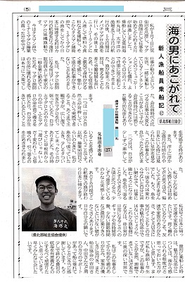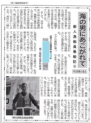 全国から集まった若手船員を、三陸新報で毎月ひとりずつ紹介していくこの企画。 スタートしたのは2014年8月ですから、5年目に入ってるんですね!! 自分でもビックリ! こんなに続くとは思ってませんでしたww 今日ご紹介しますのは、宮城県南三陸町の中学を昨年3月に卒業し 近海マグロ延縄漁船に乗船した15歳(掲載時)の少年! 高校進学率が98.8%の現在、なかなか珍しいケースであり 最初に面談した時は非常に不安な思いだったのは正直な気持ち。 しかし...
