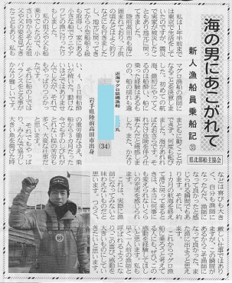 三陸新報に連載しているこの企画も35回目を迎えました。 月一回の掲載なんで、もう3年という事になりますね〜 そもそもこんなに続くとは思っていませんでしたので(笑) とても嬉しく思います!! 新人船員がこんなにも増えるとは思っていませんでしたし 勉強が苦手な人達が多いので、こんなにも大勢の人が作文を書いてくれるとは思ってもみませんでした。 そして上手いんです。 文章が上手な理由を聞くと、バンドをやっていて作詞経験があるなどいろんな理由があるのですが ダントツの...