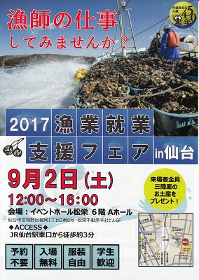 去る9月2日(土)、“漁業就業支援フェアIN仙台”に参加してきました! このブログのファンの方(いるのかなww)は 「7月にも開催されたのでは??」と思う方もいらっしゃると思います。 実はこれ、宮城県が初めて主催した漁業就業イベントなんです。 同じネーミングなので混乱するかもしれませんが 宮城県独自のイベントになります。 もちろん出展ブースは宮城県内の漁業者に限られます。 我々も宮城県からのお...