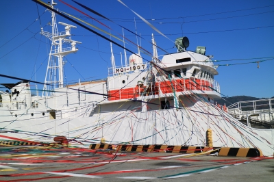 1月31日。 一隻の遠洋マグロ延縄漁船(439t)が約11か月の航海を終えて気仙沼港に帰港してきました。 時は午後3時過ぎ。 入港予定時刻を1時間以上も遅れての入港です。 風が刺さるように冷たく、車に表示される外気温は常に氷点下を示してる港。 ジッとしているのがとにかく辛く、両手をポケットに入れ、マフラーに顔を押しつけるように肩をすぼめ、常に足踏み状態。 もうその姿勢を維持するのが精いっぱいの状態です(笑) 港で待つ皆の視線が集中する湾口に、スッと船が見え...