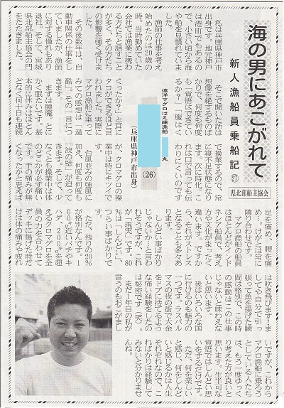 三陸新報の連載スピードに追い付くように 今日も「海の男にあこがれて〜新人漁船員乗船記」を掲載いたします。 今回紹介するのは、神奈川県出身20歳の青年。 気仙沼にマグロ漁船見学にやって来たのは昨年の夏、彼が19歳の頃だったと思います。 ヤル気はあるものの、体の線が非常に細く 「大丈夫だろうか?」と思ったのが正直なところ。 マグロ漁船を見学しながら、何回も何回も厳しい話をしましたが 彼からの返事は「大丈夫です、がんばります!」。 「大丈夫、がんばりますっての...