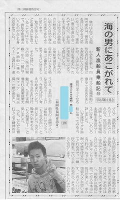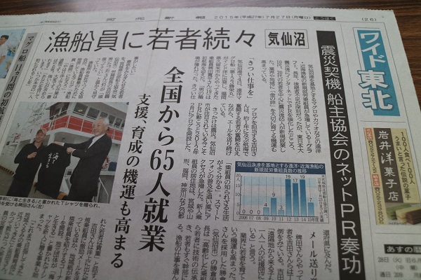 「掲載されました!」といっても先月(7月)のお話になるのですが ご紹介しかねておりまして、今となってしまいました。 「漁船員に若者続々(気仙沼)」 「震災契機 船主協会のネットPR奏功」 「全国から65人就業 支援、育成の機運高まる」 という見出しが躍り、当方の情報でありながら 大々的に掲載されますと、こちらも興奮してきます(笑) こんな記事が掲載されますと なぜ、ブログに書いただけで、こんなにも多くの方が集まるの?? という疑問が湧き出ると思います。 そのような人の考え方は・・...