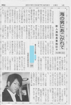 報告が遅れておりました 連載企画 第19回 「海の男にあこがれて」 第18回の彼とは水産高校時代の同級生で、この彼と同じマグロ漁船に乗船しました。 この2人は想像以上に目立つ目立つ(笑) 様々なメディアにも登場し、読売新聞にて全国版にも掲載されました! 昨年の2014年4月15日付ブログ「新聞各紙に連続して掲載されました!!」 を見ますと、その目立ちっぷりを見ることができます(笑) もうすぐ入港してくる彼の日常をご覧ください! 僕の住んでいる福岡市東区は、博多湾を囲い込むような形...
