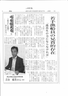 少し前の話になるのですが 4月6日付日刊・水産経済新聞において気仙沼地区での活動の様子が一面で紹介されました! この事は遠洋マグロ漁船の船主さんが運営するブログでも紹介していただきました。 「勝栄丸ブログ」 http://shoeimaru.da-te.jp/e879549.html 「清福丸ブログ」 http://ameblo.jp/seifukumaru/entry-12011439799.html 「海技士受験・要件満たす漁船員急増」という大きな見出しとともに 「3年前の”種”確実に成長」 「漁船員(漁師)になろう!」が転機」 と見出しが躍っております。...