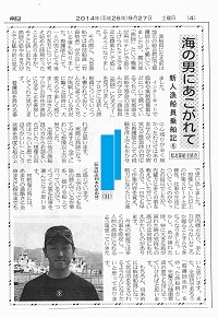 地元「三陸新報」に連載されている新人漁船員紹介企画「海の男にあこがれて」 早いもので第5回目となりました。 この企画もあちこちで話題になっているようで「いい企画ですね〜!」ってお褒めいただくことも多くなりました。 行政、宮城県や気仙沼市からも「素晴らしい企画ですね〜!」って感心されます。 先日参加した「漁業就業支援フェア(仙台会場)」でも主催者さんが 「吉田さん、あれいいですね〜!気仙沼は凄いですよ」と驚かれてました。 少しでも漁船漁業に目を向けていただいていることを とても嬉しく思いま...
