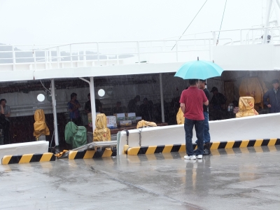 前回は実技研修の様子を紹介しましたが その彼もいよいよ出港です。 約1年にわたる遠洋マグロ漁船での生活がはじまります。 仕事はもとより、船内生活自体がはじめての彼には 航海自体が大冒険そのもの。 出港当日はあいにくの雨。 時折、強く降りだします。 厚い雲から入り込む日差しは弱く どんよりとしております。 昔から雨の出港はとても縁起が良いと言われており 雨を魚にみたて、船に雨が降り込むと魚も降り込む、大漁になると言われております。 私も傘をさしながらの見送り、そして写真撮影・・・ 雨...