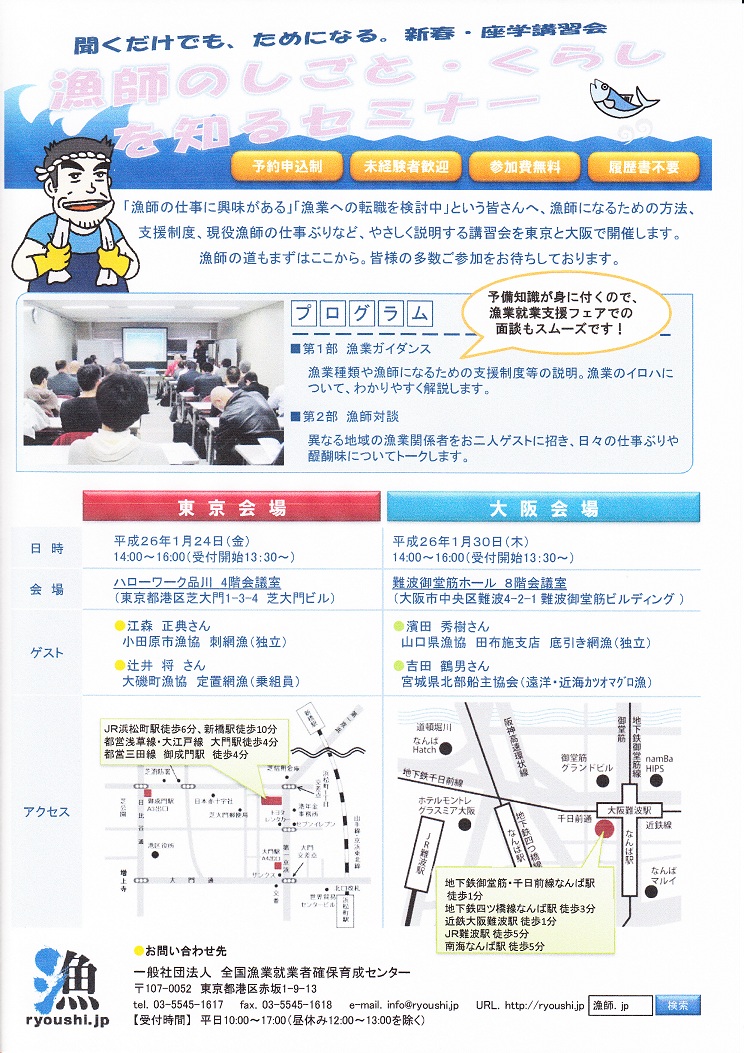 平成26年1月30日(木) 14時〜16時(受付開始13時30分) 難波御堂筋ホール 8階 会議室 において「漁師のしごと・くらしを知るセミナー(大阪会場)」に講師参加いたします! この講師のお仕事ですが、これで3回目を数えます。 普通は現場漁師の方々が講師として招かれ、現場の生の声を聞かせるのが筋なのですが そこに現場乗組員でも船主でもない私が招かれるわけです。 なぜなんでしょう? それは圧倒的な数を扱っているからだと思います。(自画自賛) 宮城県北部船主協会には 遠洋マグロ延縄...