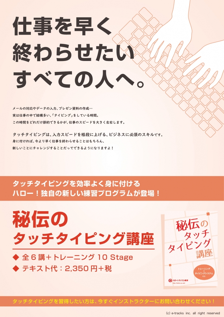 JUGEMテーマ:転職活動 こんにちは♪ アリオ鷲宮2階にある ハロー!パソコン教室イトーヨーカドー鷲宮校 インストラクターの北村です。 皆さんは「タッチタイピング」という言葉をお聞きになったことが ありますでしょうか? この言葉、一昔前は「ブラインドタッチ」と呼ばれていました。 パソコンで文字を打つ時に、手元を見ないで入力できることを言いますね。 仕事でパソコンを使うときに、このタッチタイピングができると、 ・依頼されたデータ入力を早く終わらせることができ...