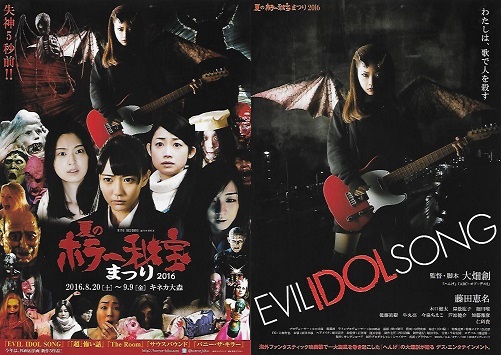 ホラー秘宝祭りから、この日2本目としてEVIL IDOL SONGを鑑賞。 藤崎佳奈(藤田)はグラビアをやりながらもシンガーソングライターとしても活躍する売れないアイドル。 プロダクションは歌手としては売れない彼女を業界のプロデューサーに枕営業させようとしている。 そして彼女は日々のストレスが原因なのか、黒い影につきまとわれる恐怖に怯えていた。次第に精神バランスを崩していく佳奈。 そんなある日、佳奈に1つのメロディが浮かぶ。それは聴いた者を殺す事の出来る禁断のメロディだった。 そして佳奈が発する歌声の刃...