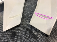 地味な年末を迎えている@おざさです。 ということで。 今回は機体後部にあるスリットの修正です。 ここにも「押し出しピン跡(丸い金型の跡)」があります。 なんでこげんかとこにあるっちゃろかね? 修正めんどくさかぁ(笑)。 両サイドに引けがありますので瞬間接着剤で埋めます。 よく見るとここにも引けが・・・ 全体を磨き上げてるとなんかおかしい。。。 矢印部分のスリットの厚みと角丸の形状が若干違う(笑)。 分厚い左の方を削って右側に合わせます。 この...
