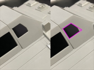 乾燥気味ですが爽やかな秋空の、@おざさです。 ということで。 今回は本体上面にある、ツインレーザー砲部の台座の箱と 後部のフラップ部分の表面の削りと面合わせです。 まず、ピンクで囲ったとこをすべて削り落とします。 大変です(笑)。 削りすぎないようにカッターナイフなどで ゆっくり削り落としていきます。 なんとか削り終え、フラップとの合いを確かめると・・・ なんか全然合っていない(大汗)。 そのうえ、フラップのこの部分が異常に薄いので 裏からプラバンを当てて...