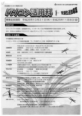 北海道立旭川高等技術専門学院 再就職のための職業訓練 パソコン活用科 追加募集中 JUGEMテーマ:研修 北海道立旭川高等技術専門学院 再就職のための職業訓練 パソコン活用科 追加募集中