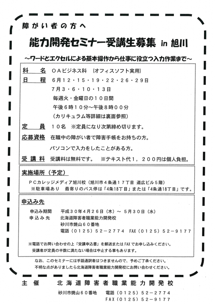 障がい者の方へ 能力開発セミナー受講生募集inPCカレッジメディア旭川校 主催北海道障害者職業能力開発校 JUGEMテーマ:研修 詳しくはお問い合わせください 個別指導のパソコン教室 PCカレッジメディア旭川校 TEL0166-26-0387 担当大宮 フリーダイヤル0120-17-1500 PCカレッジメディア旭川校 http://www.pc-college.jp PCカレッジメディア旭川校ブログhttp://pccollege.jugem.jp/? 北海道旭川市4条通1...