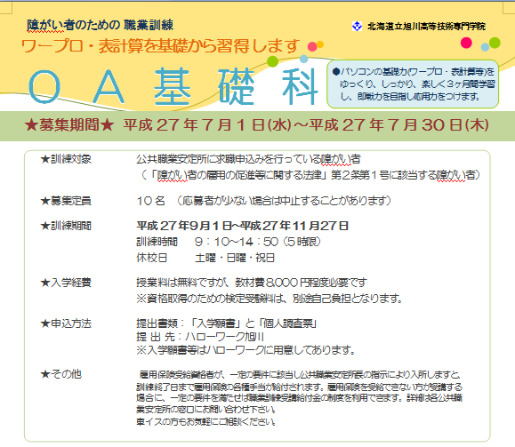 JUGEMテーマ:研修 求職者のための無料職業訓練パソコン基礎科?追加募集若干名 個別指導のパソコン教室PCカレッジメディア旭川校 詳しくはお問い合わせください 個別指導のパソコン教室 PCカレッジメディア旭川校 TEL0166-26-0387 担当大宮 フリーダイヤル0120-17-1500 ...