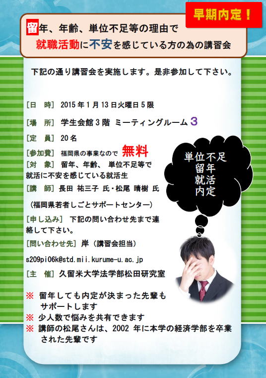 <留年、年齢、単位不足等の理由で就職活動に不安を感じている方の為の講習会> 「留年していても内定をもらえるのかどうか?」「単位が不足しているが、就活と両立できるのかどうか?」「不安で一歩が踏み出せない。」等の悩み思いを抱えている人は、いませんか?そんな悩みを抱えながら内定をもらった当研究室のゼミ生が「若者しごとサポートセンター」の協力を得てこの就職活動講習会を企画しました。 詳細は、下記の通りです。是非参加して下さい。 [日 時] 2015年1月13日火曜日5限(16:40から18:10まで) [場 所] 久留...