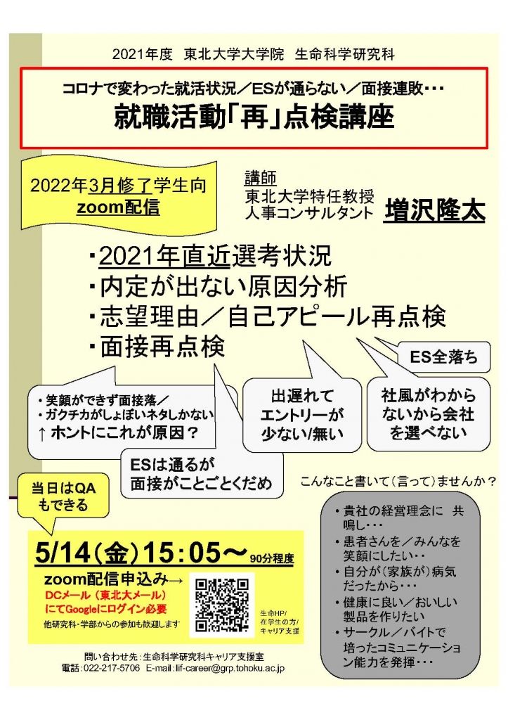 東北大学生命科学研究科では、毎年連休明けに就活で悩む学生向け講座「就職活動「再」点検講座」を行っています。 5/14(金)15時〜(90分程度。QAあり)無料 22年3月卒業/修了の大学院生や学部生、理系を想定して対策と検証を行います。 今からでも申し込めますので、ぜひエントリーして下さい。 https://sites.google.com/tohoku.ac.jp/lifesci-career/limited/seminar20210514?pli=1&authuser=1 (↑東北大DCメールでしかログインできません) JUGEMテー...