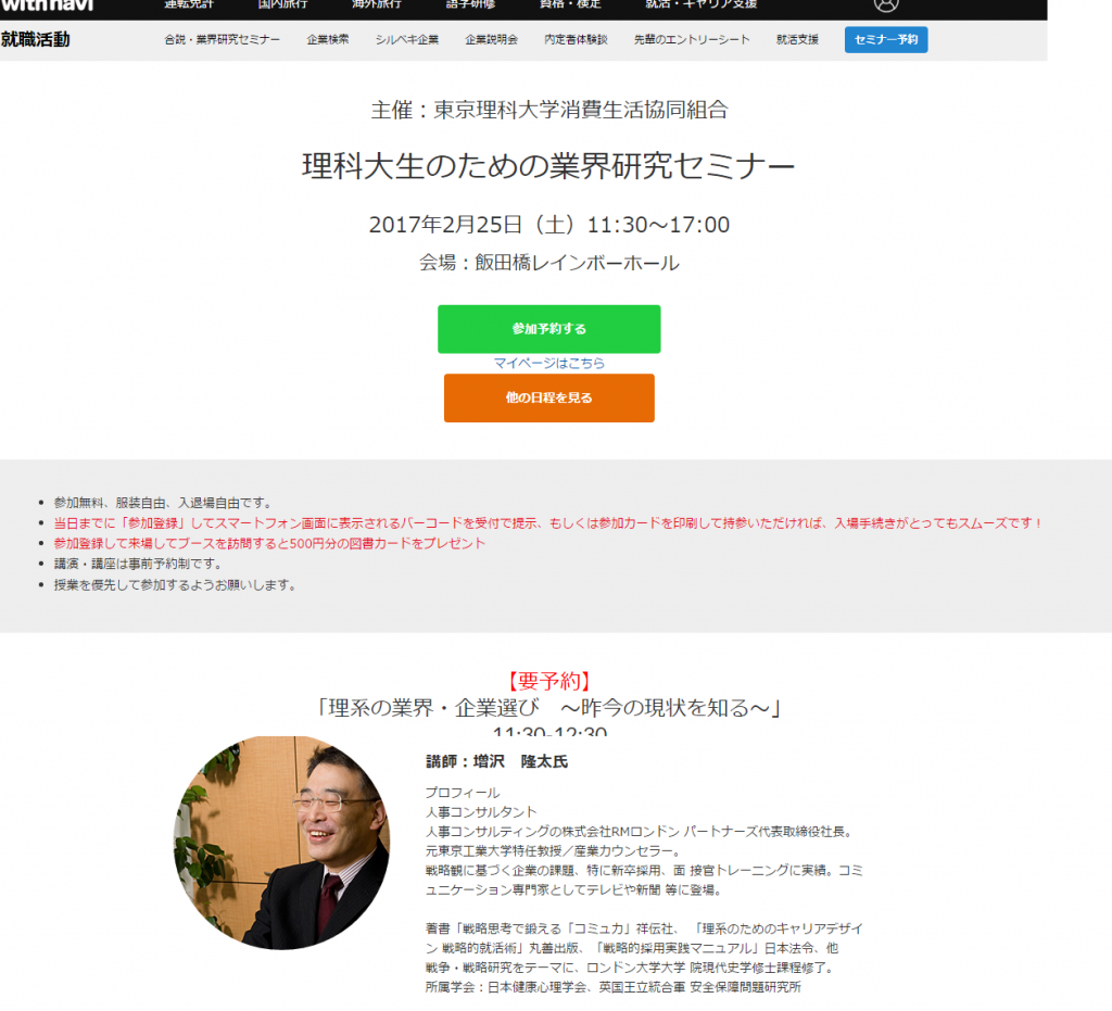 東京理科大神楽坂キャンパスの皆さん(多分それ以外のキャンパスの方も参加可能のはず) 2017年2月25日(土)11:30から、 「理科大生のための業界研究セミナー」が飯田橋レインボーホールで行われます。 http://www.withnavi.org/job/tus/20170225.html ↑ 神楽坂の人はレインボーホールわかりますよね?外堀通り、神田川沿いに神楽坂キャンパス抜けて、ブリティッシュカウンシル過ぎた辺り。 もし他キャンパスの理科大生、参加したい人は多分申し込めると思うのでぜひリンクから申し込んで下さ...
