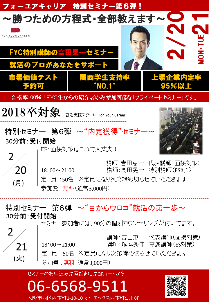 JUGEMテーマ:就職活動 本年度、第2弾セミナーを開催します。 今回も、テレビでおなじみFYC特別講師の高田先生の話も聞けます。 定員になり次第、締め切ります。
