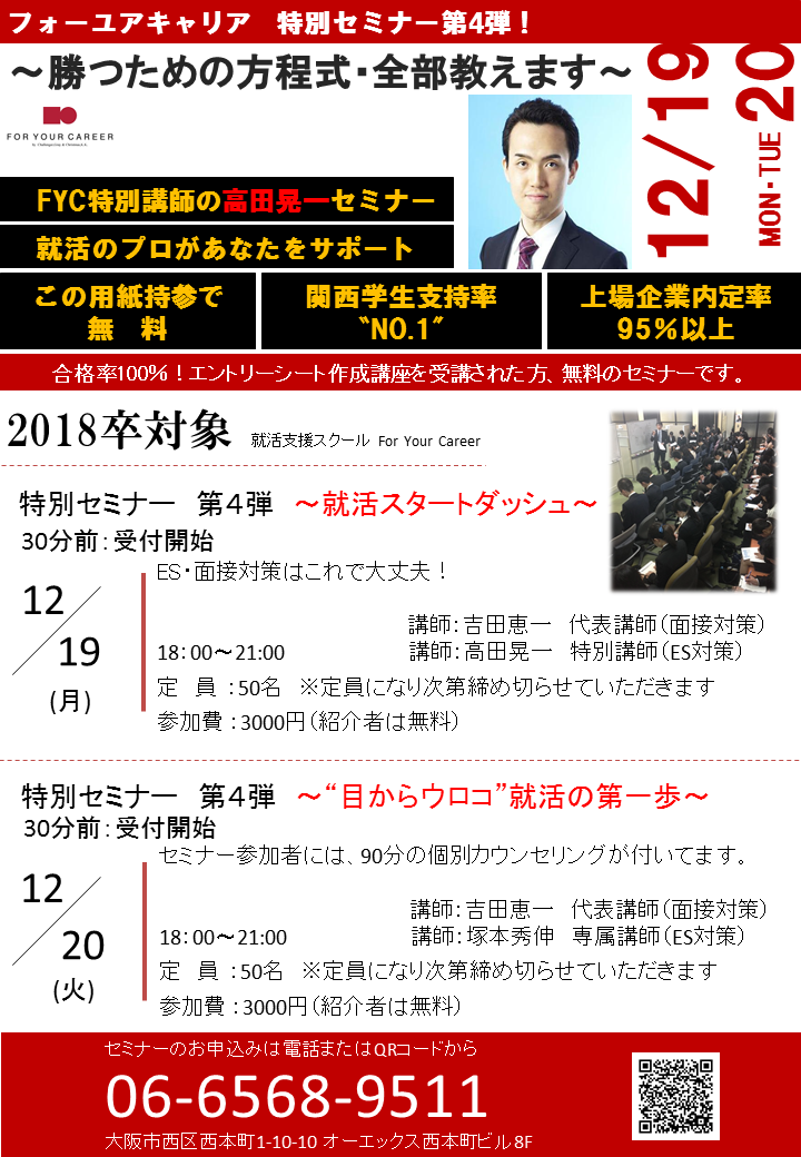 JUGEMテーマ:就職活動 インフルエンザが流行しているようですが、就活生の皆さん体調は崩していませんか? いよいよ、今年最後のセミナーを開催します。 気持ちよく年明けを迎えたい学生あつまれー!
