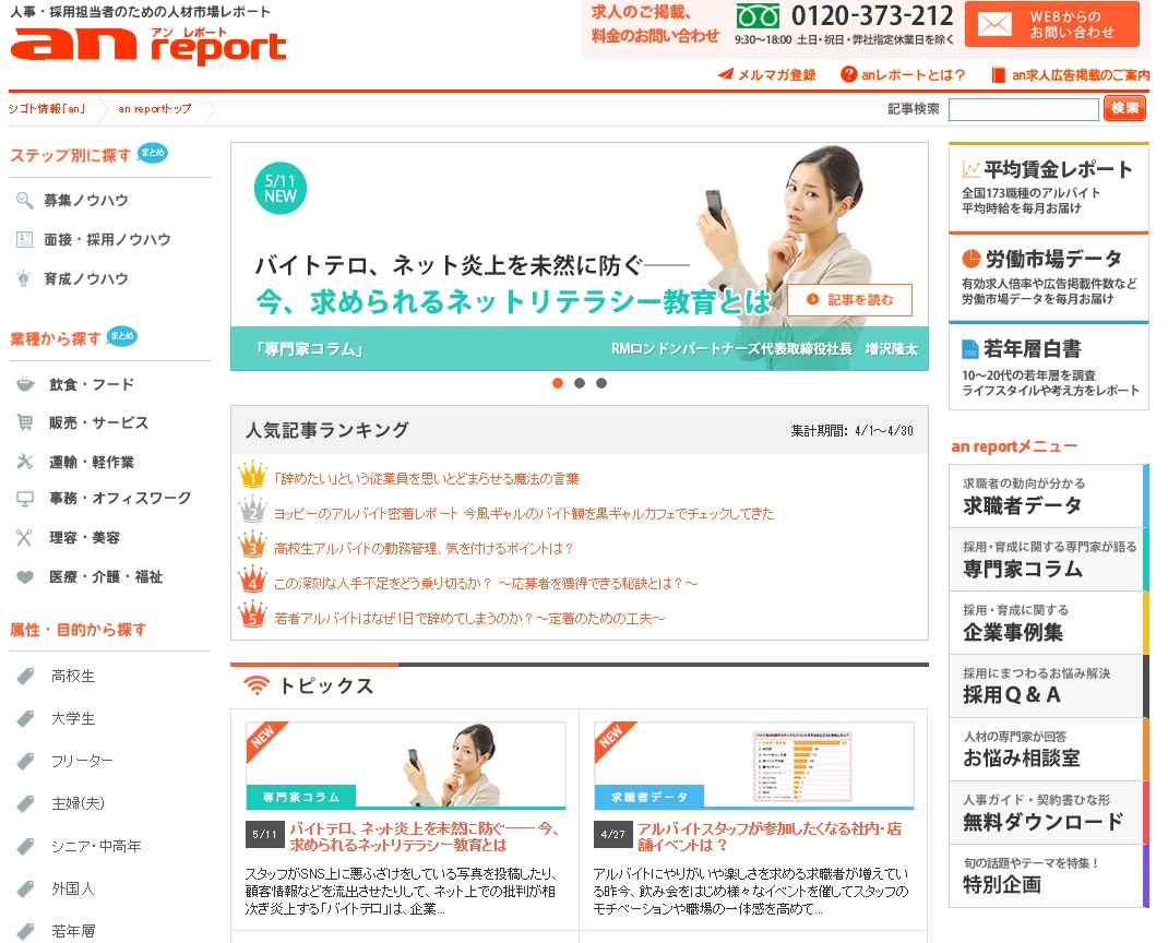 バイトテロへの個店対応について、アルバイトニュースのインテリジェンスさん主催サイトで、弊社増沢の長文インタビューが出ました。 ぜひご一読下さい。 人事・採用担当者のためのメディアサイト「anレポート」 バイトテロ、ネット炎上を未然に防ぐ―― 今、求められるネットリテラシー教育とは http://weban.jp/contents/an_report/repo_cont/pro/20150511.html JUGEMテーマ:就職活動