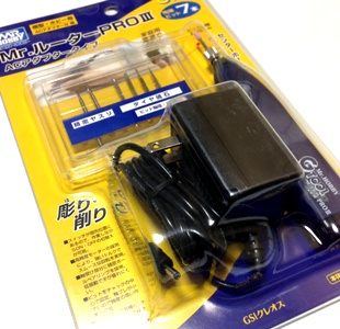 私はパテとかをもってガリガリと削るタイプの改造をすることが多いので、こういう道具が必要です。 これまでは乾電池タイプのを使ってたのですが、すぐに電池が無くなりパワーが弱くなってしまうのがちょっとなぁ という感じでしてね。充電式の電池を2セット分買って、一方を使ってる間にもう一方を充電しておくことで、ある程度安定した連続使用ができるようにとかやってたんですが、それもけっこう面倒で。電池の心配が要らない、手頃な価格のACアダプタータイプのものを探してたんです。 ということで、「Mr.ルーター...