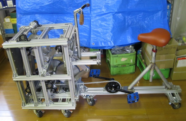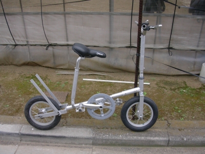 JUGEMテーマ:製作屋の裏話 倉庫を整理していたら懐かしいものが出てきた、ひとしきり眺めて捨てる。 レゴレモンと名づけた組み立て自転車だ。 ジョイント部品を様々な形で製作して、自由に組み立ててオンリーワンの自転車を作ろうと製作した残骸だ このコンセプトはパーツを組み合わせて自由に好きな形を作れることだ、三輪車や前輪駆動、リヤカー式など 材質はアルミ、ジョイント部分を溶接で組んで、パイプを組み合わせて好きな形を作って遊んでいた。 写真は旅行好きな人が電車に持ち込める携帯自転車 ハンドルとサドル...