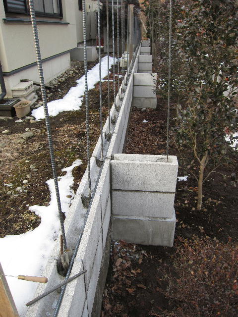 今日もK様邸の外構工事です(19日目) ブロック積みのほうは最終段階にきています。 北側の普通ブロック積みです。 最後の7段目が積み終わりモルタル充填、横筋固定をしています。 最終的には笠木用のブロックを積みます。 JUGEMテーマ:工事 西側は笠木ブロックを残して完了しています。 出入口の左右の塀もあと少しで完了です。 168