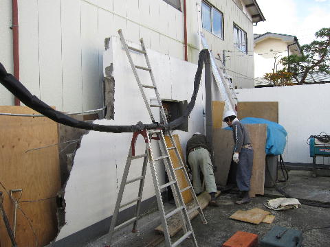 今日は東日本大震災で倒壊する恐れがあるブロック塀を解体する工事が始まりました。 ガソリンスタンドの右側の塀が倒れそうなので解体していきます。 大ハンマーやハンマードリル等を使ってブロック塀を壊していきます。 ここからは狭くなり作業は困難を極めました。 JUGEMテーマ:工事 168