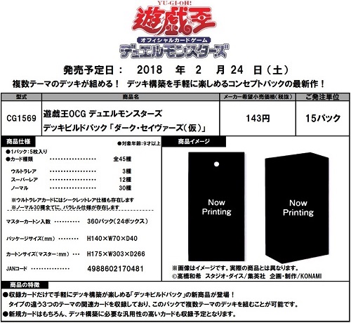 JUGEMテーマ:遊戯王 デッキビルドパック ダーク・セイヴァーズ 予約情報 <商品詳細> 発売日:2018年2月24日 定価:143円+税(1BOX2145円+税) 1パック:5枚入り 1BOX:15パック入り カード種類:45種類 (ウルトラレア:3種 スーパーレア:12種 ノーマル:30種) ウルトラレア枠にはシクあり