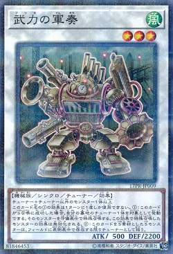 JUGEMテーマ:遊戯王 武力の軍奏 17PR-JP009 シンクロ・チューナー・効果モンスター 星3/風属性/機械族/攻 500/守2200 チューナー+チューナー以外のモンスター1体以上 このカード名の(1)の効果は1ターンに1度しか使用できない。 (1):このカードがS召喚に成功した場合、自分の墓地のチューナー1体を対象として発動できる。 そのモンスターを守備表示で特殊召喚する。 この効果で特殊召喚したモンスターの効果は無効化される。 (2):このカードをS素材としたSモンスターは、 フィールドに表...