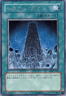 JUGEMテーマ:遊戯王 サイバネティック・レボリューションで登場したシステム・ダウンについてです。 このカードの需要がさらに上がってきています。 通常魔法 1000ライフポイントを払う。 相手フィールド上と相手の墓地の機械族モンスターを 全てゲームから除外する。