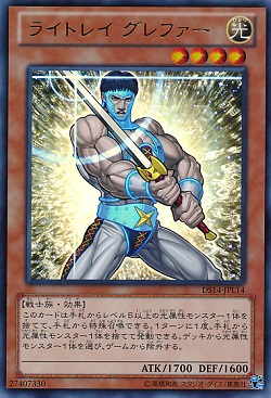 JUGEMテーマ:遊戯王 ライトレイ グレファー DS14-JPL14 効果モンスター 星4/光属性/戦士族/攻1700/守1600 このカードは手札からレベル5以上の光属性モンスター1体を捨てて、 手札から特殊召喚できる。 1ターンに1度、手札から光属性モンスター1体を捨てて発動できる。 デッキから光属性モンスター1体を選び、ゲームから除外する。