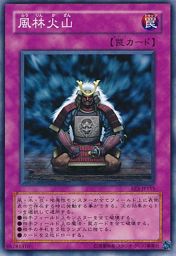 JUGEMテーマ:遊戯王 ライズ・オブ・デスティニーで登場した風林火山についてです。 通常罠 風・水・炎・地属性モンスターが全てフィールド上に 表側表示で存在する時に発動する事ができる。 次の効果から1つを選択して適用する。 ●相手フィールド上モンスターを全て破壊する。 ●相手フィールド上の魔法・罠カードを全て破壊する。 ●相手の手札を2枚ランダムに捨てる。 ●カードを2枚ドローする。