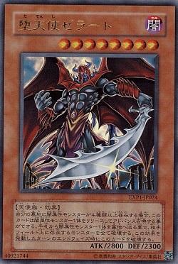 JUGEMテーマ:遊戯王 エクストラパック1収録の堕天使ゼラートについてです。 このカードの需要が最近になって上がってきています。 効果モンスター 星8/闇属性/天使族/攻2800/守2300 自分の墓地に闇属性モンスターが4種類以上存在する場合、 このカードは闇属性モンスター1体をリリースしてアドバンス召喚する事ができる。 手札から闇属性モンスター1体を墓地へ送る事で、 相手フィールド上に存在するモンスターを全て破壊する。 この効果を発動したターンのエンドフェイズ時にこのカードを破壊...