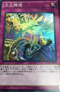 JUGEMテーマ:遊戯王 インベイジョン・オブ・ヴェノム収録の次元障壁についてです。 このカードのレアリティや画像などが判明したようです。 通常罠 「次元障壁」は1ターンに1枚しか発動できない。 (1):モンスターの種類(儀式・融合・S・X・P)を1つ宣言して発動できる。 このターン、お互いに宣言した種類のモンスターを特殊召喚できず、 フィールドの宣言した種類のモンスターの効果は無効化される。
