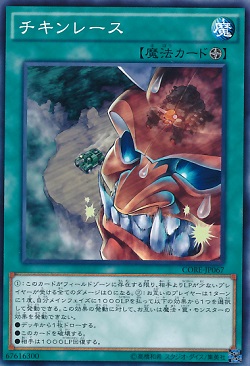 JUGEMテーマ:遊戯王 クラッシュ・オブ・リベリオン収録のチキンレースについてです。 フィールド魔法 (1):このカードがフィールドゾーンに存在する限り、 相手よりLPが少ないプレイヤーが受ける全てのダメージは0になる。 (2):お互いのプレイヤーは1ターンに1度、 自分メインフェイズに1000LPを払って以下の効果から1つを選択して発動できる。 この効果の発動に対して、お互いは魔法・罠・モンスターの効果を発動できない。 ●デッキから1枚ドローする。 ●このカードを破壊する。 ●相...