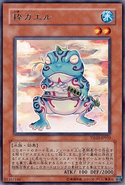 JUGEMテーマ:遊戯王 ザ・シャイニング・ダークネス収録の粋カエルについてです。 効果モンスター 星2/水属性/水族/攻 100/守2000 このカードのカード名は、 フィールド上に表側表示で存在する限り「デスガエル」として扱う。 また、自分の墓地の「ガエル」と名のついたモンスター1体をゲームから除外する事で、 このカードを墓地から特殊召喚する。 このカードはシンクロ素材にできない。