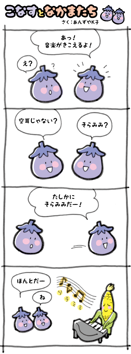 ☆★<よいこのみんなへまめちしき>★☆ 「空耳(そらみみ)」は、ほんとうは音も声もしていないのに 聞こえるような気がすること。 これは、雑音や空気音などを 脳が「たぶんこうだろう」と、勝手に決めてしまうためらしいよ。 フシギだね。 また、外国の歌や、外国語がヘンな日本語に聞こえたりするときも使うよ。 気に入ってくれたらシェアしてね♪