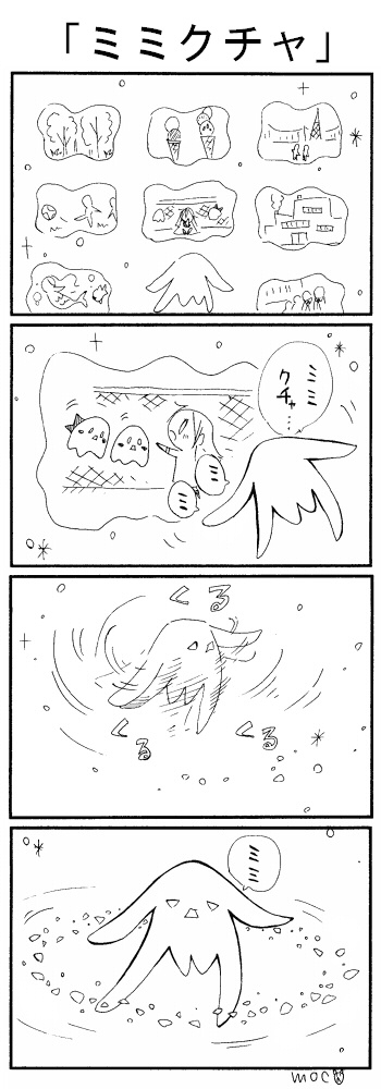 こんにちは、mocoです☆ はい!今日もクチャクチャ〜 そらたちの様子を見てる耳の長いクチャクチャ、ミミクチャ初登場です☆ ミミクチャ ミ ミ JUGEMテーマ:オリジナル4コマ・マンガ