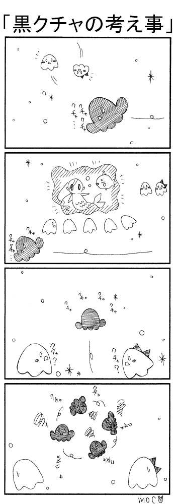こんにちは、mocoです☆ はい!今日もクチャクチャ〜☆ 前回のそらとのことを、黒クチャは宇宙に帰って色々考えています。 クチャ★ 黒クチャパニック★ JUGEMテーマ:オリジナル4コマ・マンガ