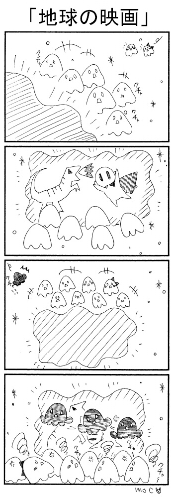 JUGEMテーマ:オリジナル4コマ・マンガこんにちは。mocoです☆ はい!今日もクチャクチャ! 宇宙でクチャクチャたちは、人間が見てる映画を見るみたいです。 クチャクチャ〜☆