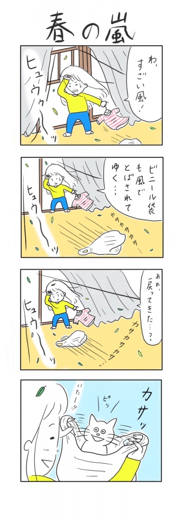 JUGEMテーマ:4コマ漫画 昨日、今日と、とても風の強い日でした。 最近、猫はビニール袋の中に入ることが好きみたいで、 ビニール袋が動いているなぁ〜と眺めていたら、 中に猫が入っていたという珍事が最近我が家ではよく起こります。 猫って本当に面白い生き物ですね。。 そうそう、そんな面白い...