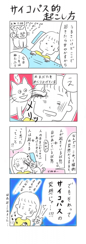 UGEMテーマ:4コマ漫画 春はただでさえ眠いのに、 毎朝猫に起こされるので寝不足気味まっしぐらです。 さすがにまぶたをめくられた時は 「それはやっちゃいけないヤツでしょ!? それくらいわかるでしょ!? ねぇ!!」 と猫の肩をつかんで真顔でつめ寄ってしまいました。 ほかにも猫による起こされ方が何パターンか。 (起こされ方とその起床率) &nbs...