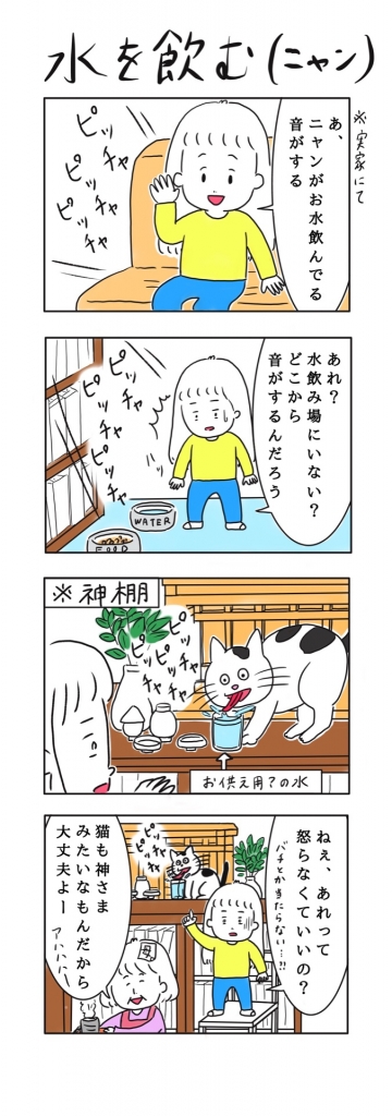 JUGEMテーマ:4コマ漫画 GWは実家の茨城に帰省し、 久しぶりに実家の猫ニャンちゃんに会えてうれしかったです(^^♪ 神棚の水を飲むニャン。↑ ニャンにもびっくりしましたが、 それを日常の光景として普通に扱っている両親にもおどろきました。笑 それにしても...